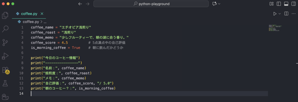 「今日のコーヒー」を、個別の変数に分けて書いてみます。